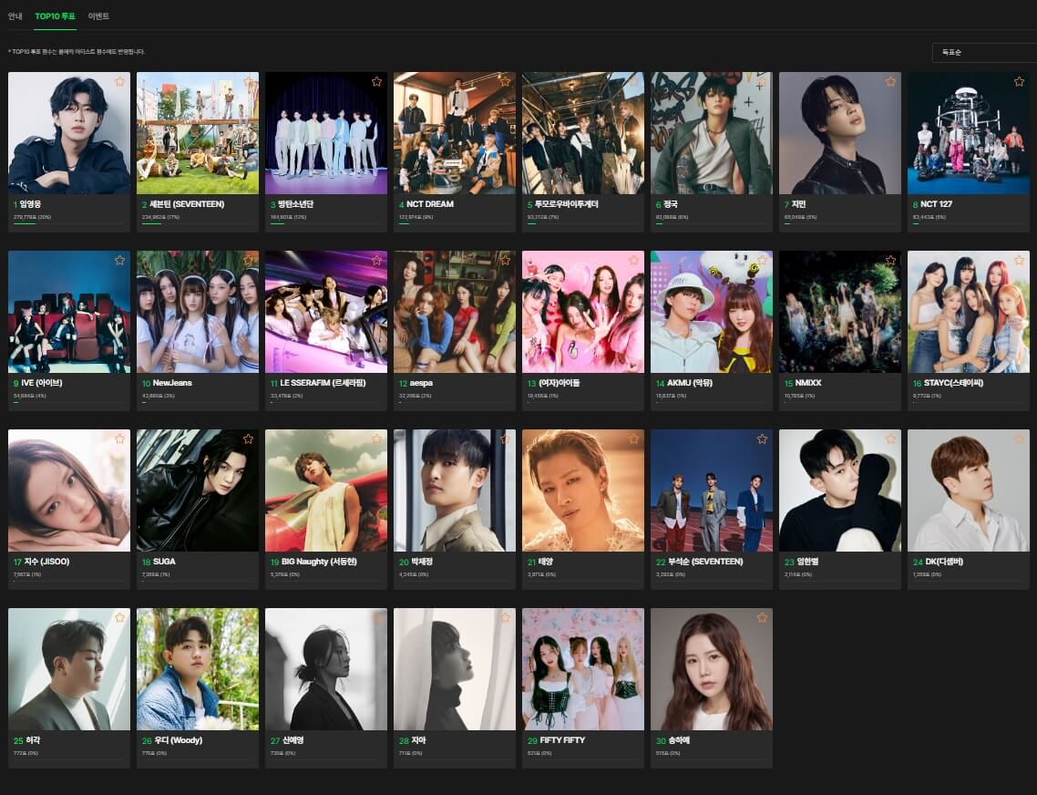 ์ธ๋ธํด(SEVENTEEN) / ์์์ / ๋ฐฉํ์๋ ๋จ / NCT DREAM / ์ ๊ตญ / ํฌ๋ชจ๋ก์ฐ๋ฐ์ดํฌ๊ฒ๋ / NCT 127 / IVE(์์ด๋ธ) / ์ง๋ฏผ / Newjeans / aespa / LE SSERAFIM (๋ฅด์ธ๋ผํ) / AKMU(์ ๋ฎค) / (์ฌ์) ์์ด๋ / NMIXX / STAYC(์คํ ์ด์จ) / SUGA / ์ง์ / BIG naughty(์๋ํ) / ๋ฐ์ฌ์ / ํ์ / ๋ถ์ ์(SEVEN TEEN) / ์ํ๋ณ / DK(๋์ ๋ฒ) / ์ฐ๋ / ํ๊ฐ / ์ง์ / ์ ์์ / ์กํ์ / FIFTY FIFTY